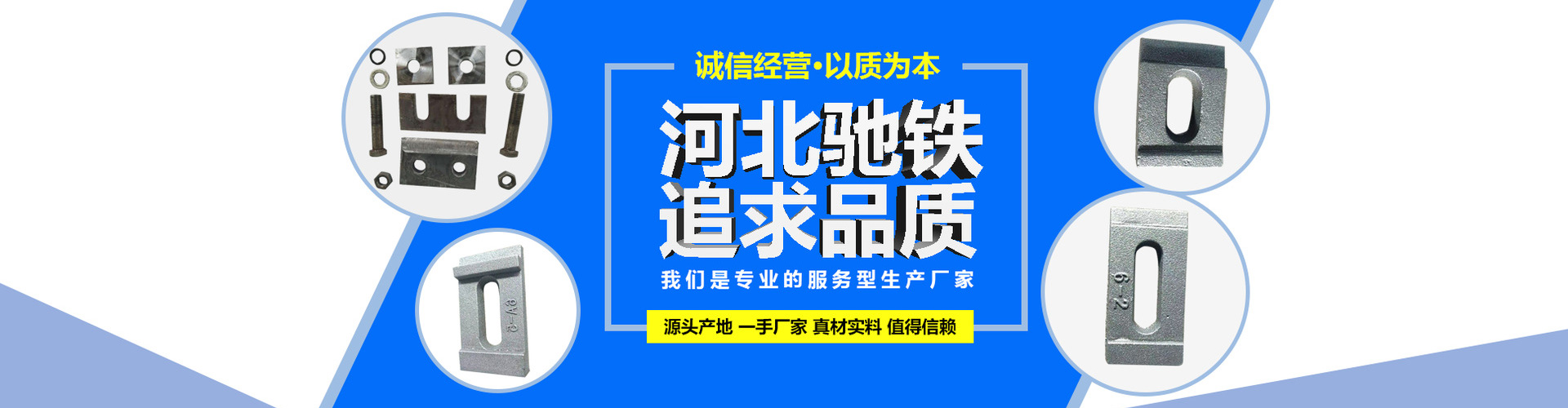 主要產(chǎn)品:鐵路配件、行車(chē)配件、工礦配件、魚(yú)尾板、道釘、壓軌器、軌道壓板、軌距拉桿、護(hù)軌扣板、T型螺栓、魚(yú)尾螺栓、彈條、軌距擋板
