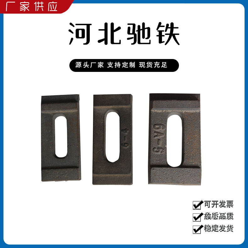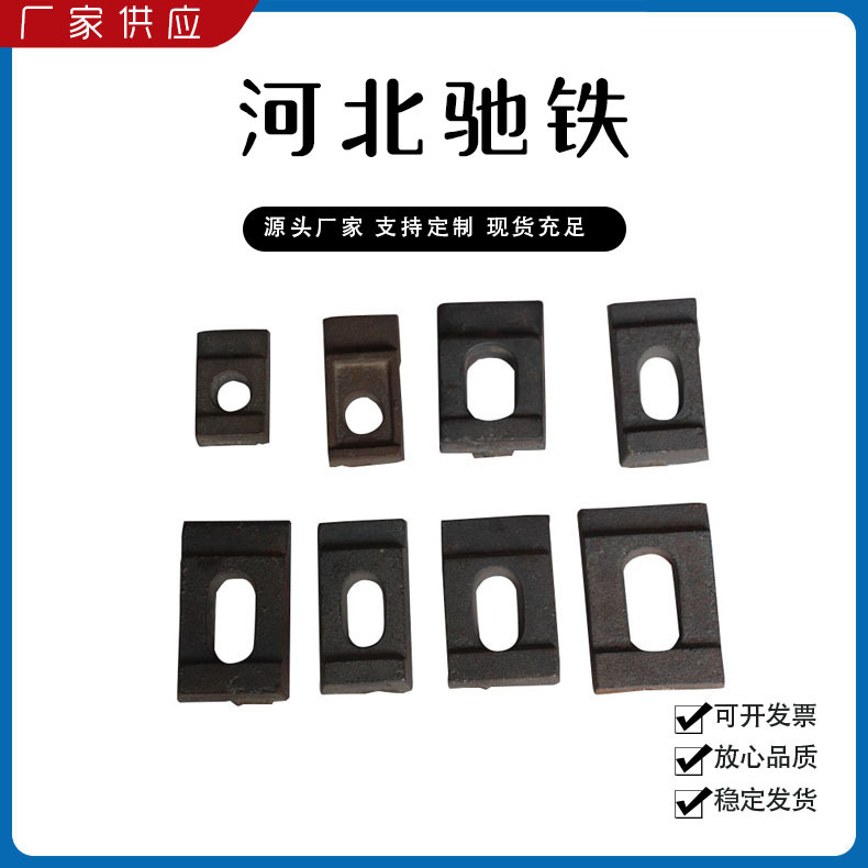 主要產(chǎn)品:鐵路配件、行車(chē)配件、工礦配件、魚(yú)尾板、道釘、壓軌器、軌道壓板、軌距拉桿、護(hù)軌扣板、T型螺栓、魚(yú)尾螺栓、彈條、軌距擋板
