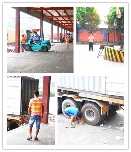 特別針對(duì)口岸場(chǎng)站叉車(chē)掏箱作業(yè)存在的由于集卡未停穩(wěn)容易造成叉車(chē)從平臺(tái)墜落的安全隱患提出了解決方案并得到落實(shí):叉車(chē)進(jìn)入集裝箱前,叉車(chē)人員需確認(rèn)集卡車(chē)停穩(wěn)(確認(rèn)方式:后輪墊好三角木)。叉車(chē)作業(yè)完成后,向集卡車(chē)司機(jī)示意取走三角木,集卡車(chē)才能駛離。開(kāi)箱作業(yè)時(shí)使用鏈條輔助開(kāi)箱。對(duì)查驗(yàn)平臺(tái)閑雜人員可隨意進(jìn)入等影響叉車(chē)作業(yè)和查驗(yàn)工作的人統(tǒng)一進(jìn)行整理,現(xiàn)場(chǎng)工作人員需佩戴工作證,穿反光衣,其他無(wú)關(guān)人員不得上查驗(yàn)平臺(tái)。